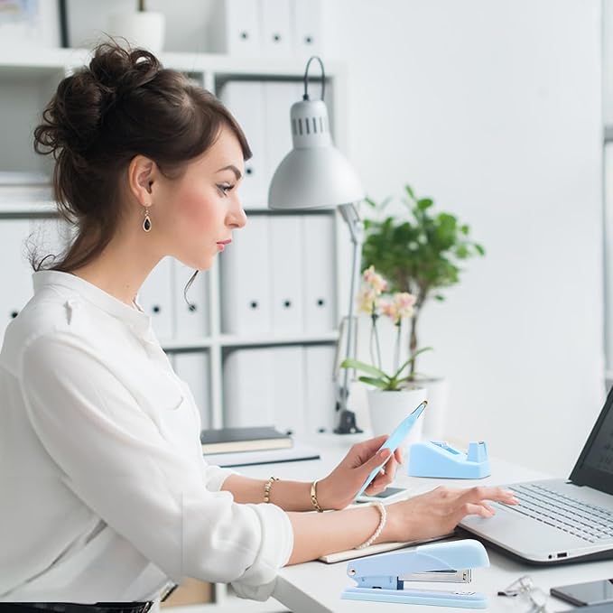 - Quality Material - Stapler and tape dispenser set made of high-quality plastic material, which is reliable, clear and bright,beautiful and lovely; Blue desk accessories is smooth and comfortable to touch, not easy to break or deform. The bottom of the blue stapler is designed with soft rubber anti-slip, so you don't have to worry about scratching the desktop.