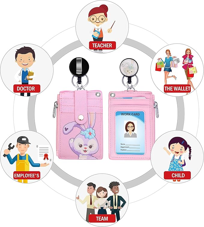 Cute ID Badge Holder Retractable Lanyard Reel Clip with Heavy Duty Carabiner,5 Card Slots in 2 Sided with Key Ring and Zipper for Students Teens Boys Girls Office Staff Women (Purple Rabbit)