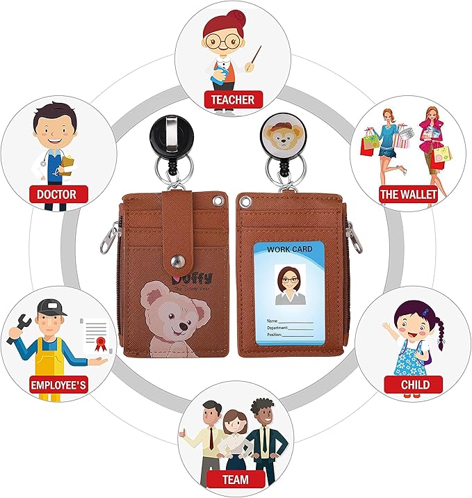 Cute ID Badge Holder Retractable Lanyard Reel Clip with Heavy Duty Carabiner, 5 Card Slots in 2 Sided with Key Ring and Zipper for Women Students Teens Girls Office Staff (Brown Duffy)