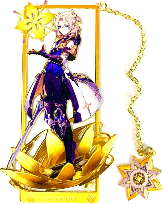 - Immerse yourself in the enchanting world of Genshin Impact with our Albedo brass bookmarks, designed for fans of this captivating anime game
