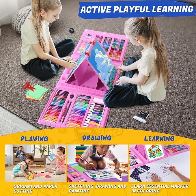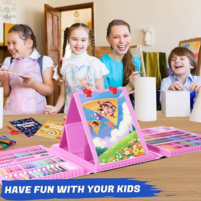 All in One Art Supplies, Art Kit Includes Easel, Origami Paper, Colored Pencils, Crayons, Drawing Book, Coloring Book, Watercolor Pens, Markers and Oil Pastels, Gifts for Girls Boys Teens, Pink