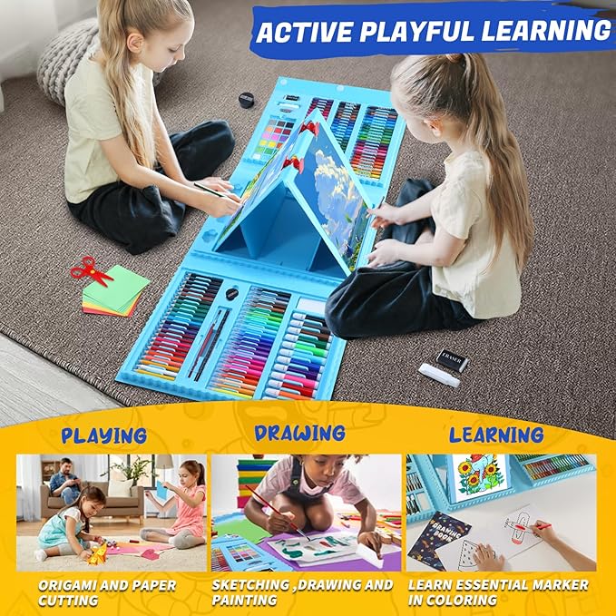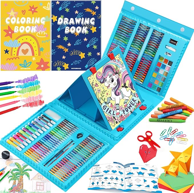All in One Art Supplies, Art Kit Includes Easel, Origami Paper, Colored Pencils, Crayons, Drawing Book, Coloring Book, Watercolor Pens, Markers and Oil Pastels, Gifts for Girls Boys Teens, Blue