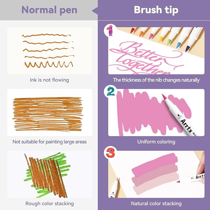 - Safe and Non-toxic - Arrtx drawing markers set adopts water-based environmental protection pigment ink, which is non-toxic, tasteless, waterproof, and high temperature resistant. With high-quality certificated ink makes these painting pens safe and suitable for both adults for all kinds of DIY paintings.