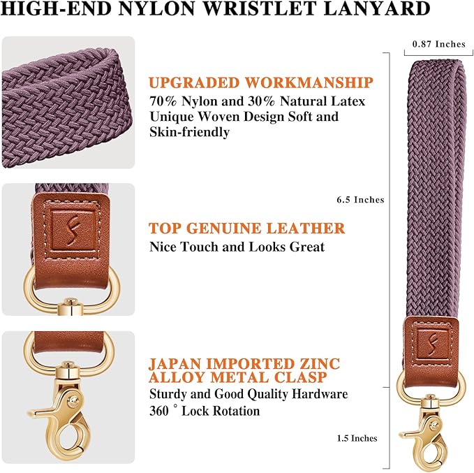 - Upgraded Stretchy Design: Fishent wrist lanyard is roughly 0.87 inches width and 6.5 inches length from the bottom of the leather to the top of the wrist key loop, with super-soft weave strap(stretchy), genuine leather and quality metal wristband keyring clasp lanyards for keys. The hand wrist lanyards keychain adopt unique upgraded stretchy nylon design, the wrist strap is soft and textured. Comfortable to wear and not easily deformed