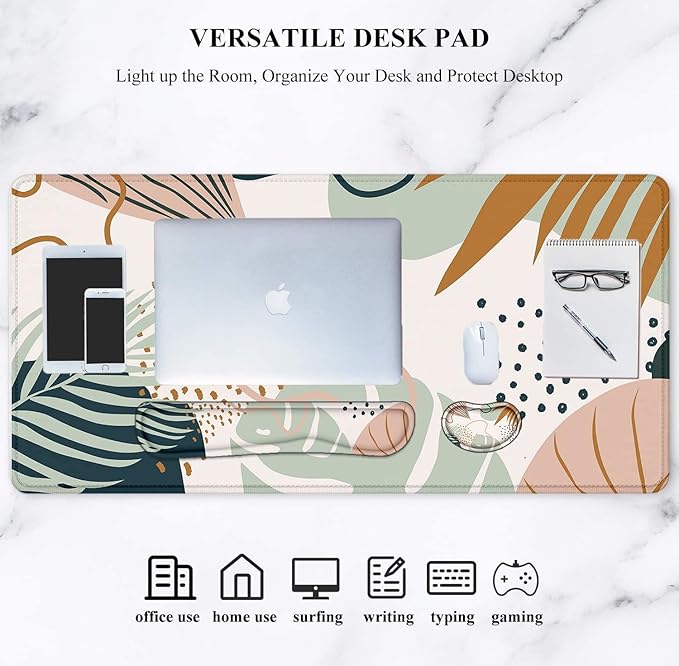 - 【4-in-1 Mouse Pad Set】Our large mouse pad and wrist rest set includes desk pad (35.4x15.7inch), keyboard wrist rest(16.9x3.5inch), mouse wrist rest(5.5x3.1inch), cup coaster(3.5x3.5inch). No need to buy separately, at a super cost-effective price. This desk pad for keyboard and mouse is large enough to fit your mouse, gaming keyboard, and other desk items. Our desk pad protector can keep a clean, uncluttered desk. This helps to improve the gaming experience or work efficiency in the office.