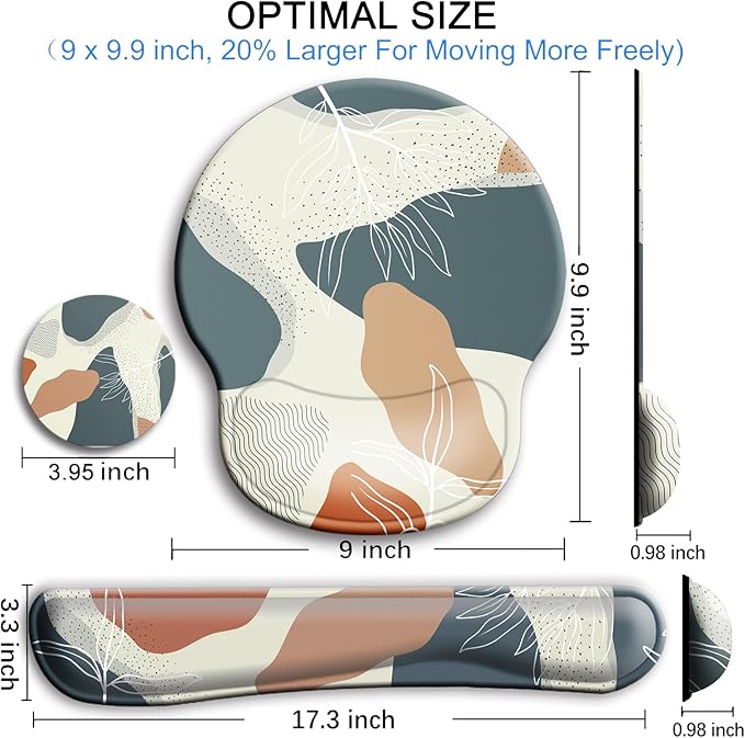 - Larger:Wrist mouse pad (9 x 9.9 inch) 20% larger than usual to ensure slide more conveniently , keyboard wrist rest ( 17.7 x3.5 inch), coaster (3.95x3.95 inch).