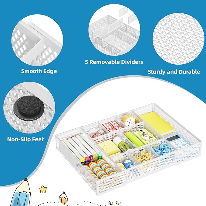 Marbrasse Expandable Desk Drawer Organizer, Mesh Drawer Organizer Tray with 10 Adjustable Compartments, Desk Organizers and Accessories, 5 Dividers Drawer for Office Supplies, Makeup & Vanity (White)