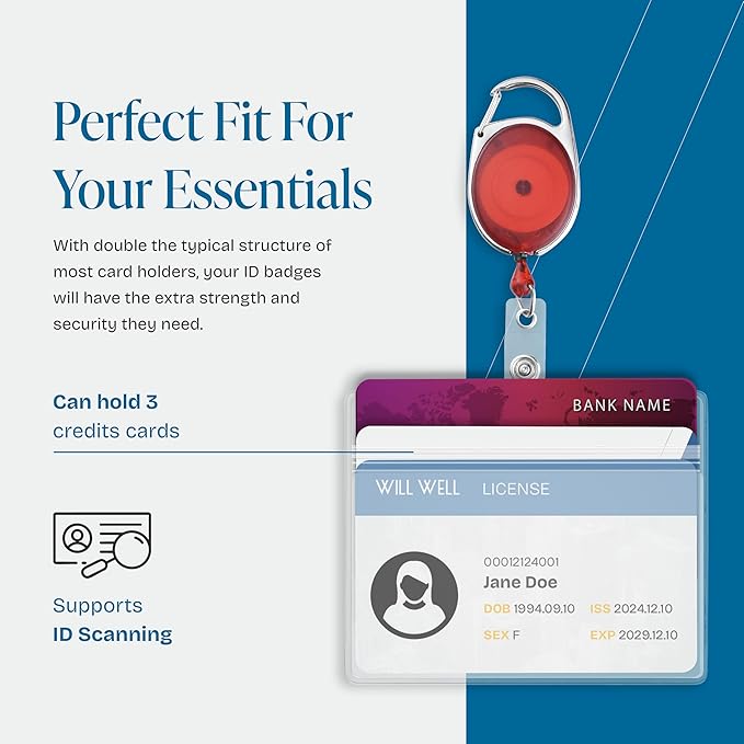 Will Well ID Badge Holders with Clip and Keyring - Horizontal Clear Plastic 3.7" x 2.5" Sleeves Fit Up to 3 Cards - Retractable 24" UHMWPE Fiber Pull Cords - 2-Pack, Transparent Red Reels