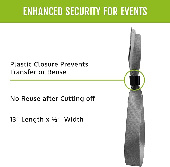 - Enhanced Security & Fraud Prevention for Events: Each band’s plastic closure is designed to prevent transfer or reuse. In fact, to be removed, our cloth wristbands must be safely cut using scissors. Once removed, these fabric wristbands cannot be reused.