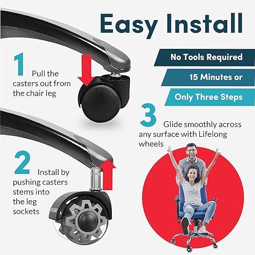 - DESK CHAIR MAT WILL NOT BE NEEDED ANYMORE – Our desk chair wheels replacement will NEVER scratch, smudge or damage your floors. Enjoy a carefree, safe glide across wood, hardwood, laminate, vinyl, tile and carpet floors all day long. P.S. Regarding the smooth rolling on carpet it depends on the pile carpet that you have, some roll better and some aren’t as smooth. High pile carpet usually rolls less smooth than low pile.