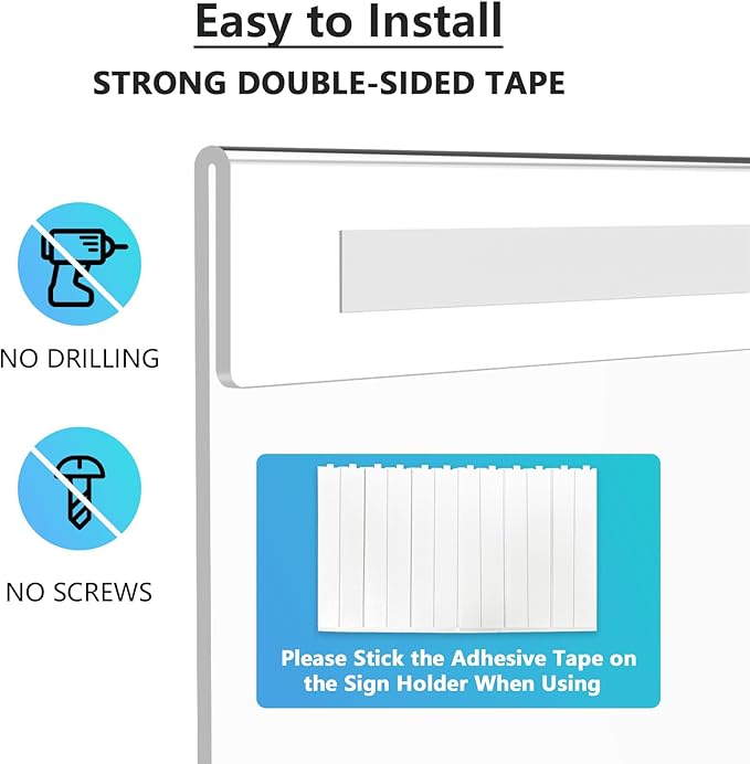 - Easy to install: Our acrylic sign holders use double-sided tape for quick and effortless mounting on any flat surface - no screws, drills, or tools needed. Works on drywall, metal, plastic, wood, glass, window and more.