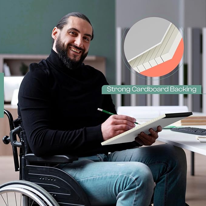 - Convenient Tear-Off Feature & Durable Support: Our note pads feature a convenient perforated tear-hole line at the top of each page, allowing for effortless tear-off when needed. This feature saves you time and ensures a smooth detachment without any ripping. Furthermore, our legal pads are equipped with a sturdy 900gsm cardboard backing that provides optimal stability. Whether you're sitting, standing, or on the go, our notepads offer a consistently comfortable writing experience