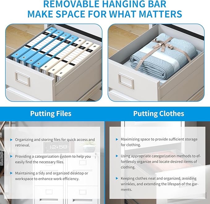 - 【Space-Saving & Versatile】This vertical file cabinet is designed to minimize the space it occupies, compact design allows it to fit seamlessly into tight corners or narrow spaces, making it an ideal choice for small offices or home workspaces. The adjustable hanging rods in each drawer allow you to customize the interior to suit your specific needs, whether you’re storing A4, letter, or legal-size documents.