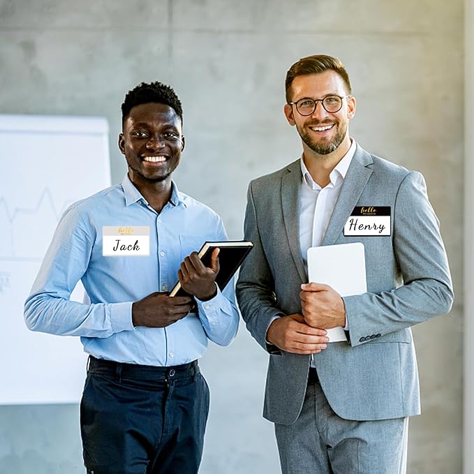 - 216 pcs hello my name is stickers, 3.5 x 2.25 inch large label stickers size. 6 classic color assortments with casual script gold foil font, enough space for writing. This is the easy-match and cost-efficient way for your networking event, party, reunion, meetings, wedding, office, classroom and more.