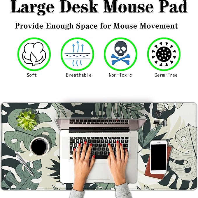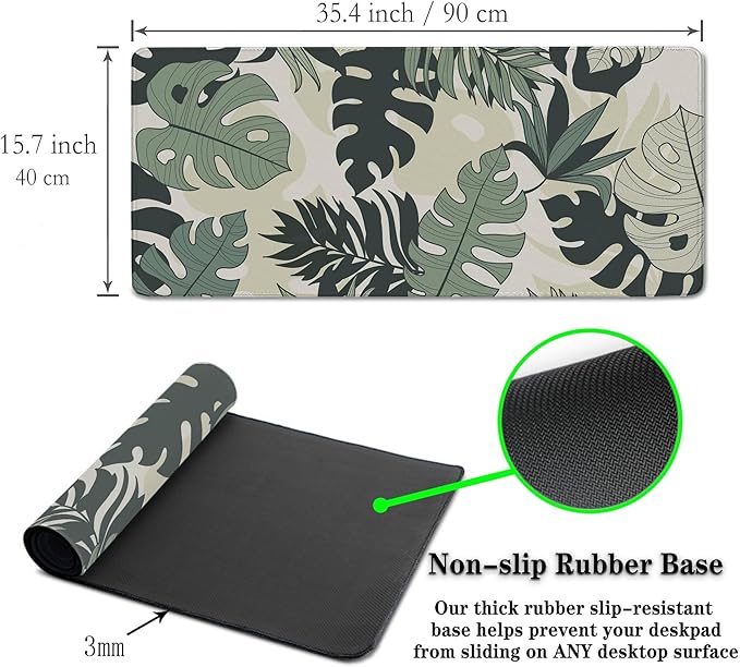 Large Mouse Pad Long Mousepad Desk Mouse Pads Keyboard Mats Gaming Mouse Mat Non-Slip Rubber Base Waterproof with Stitched Edges 35.4 X 15.7 for Game Office, Monstera Leaves