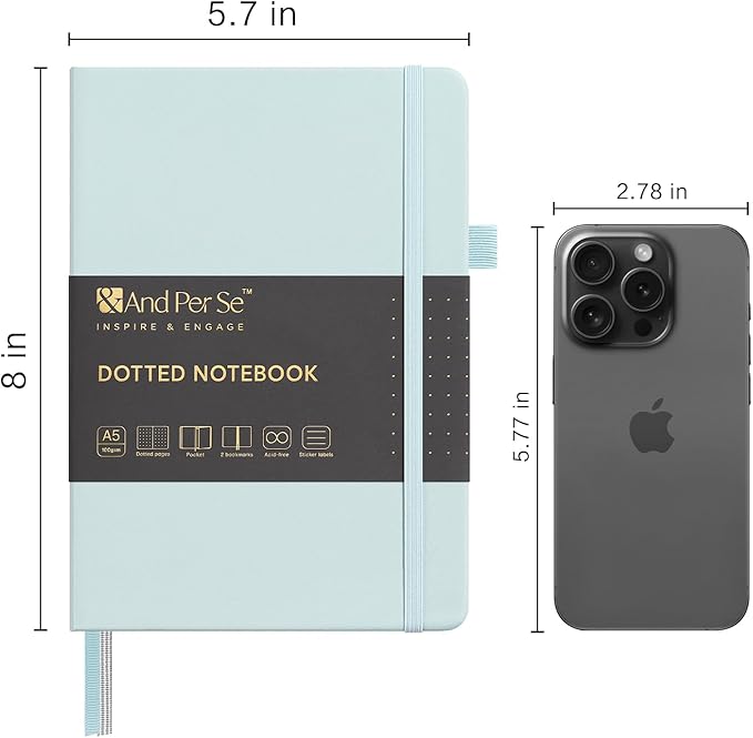 &And Per Se Dotted Journal Notebook, A5 Hardcover Leather Bullet Dotted Journal, 160 Pages 100 gsm Thick Paper, 3 Sheets of Stickers Included- 5.7'' x 8''(Cyan)