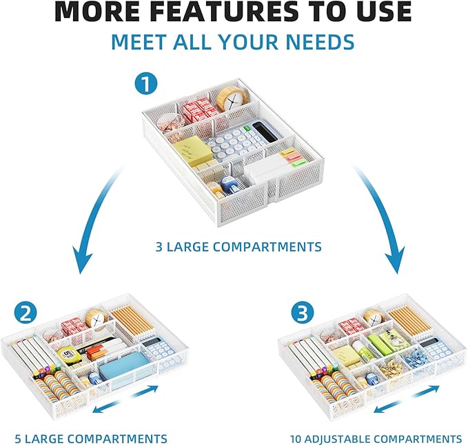 Marbrasse Expandable Desk Drawer Organizer, Mesh Drawer Organizer Tray with 10 Adjustable Compartments, Desk Organizers and Accessories for Office Supplies, Makeup & Vanity (Expandable White-2 pack)