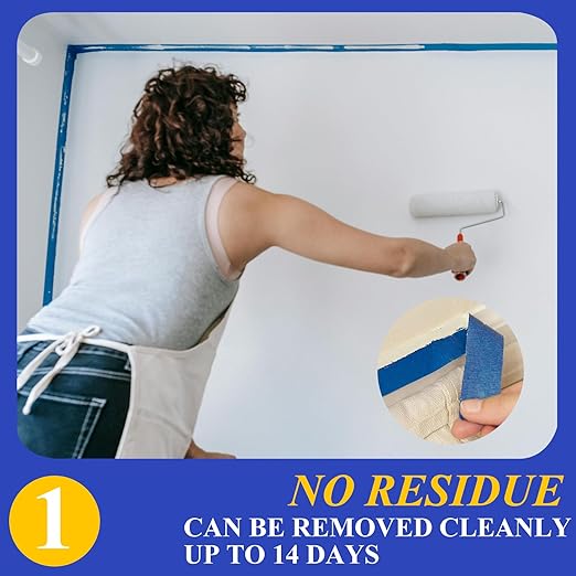- No Residue - Blue masking tape adopts high quality medium adhesive glue that ensured blue painter's tape can be removed easily without leaving a sticky residue, won't damage the wall, paint or paper. And it has fast adhesion, great for masking jobs. Such blue painting tape can adheres quickly and be used in smooth or lightly textured walls, trim, baseboards, tile and glass, metal, ceramic tiles, hardwood floors, plastic. Note: For better effect, prevent sticky side long-term exposure to air.