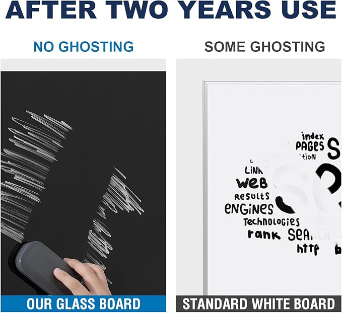 - PREMIUM GLASS WHITEBOARD - 36 x 24 inches glass whiteboard comes with smooth, strong and durable tempered glass surface, which is resists scratches and dents. This premium glass allows you to write, erase and rewrite on a clean surface every time.