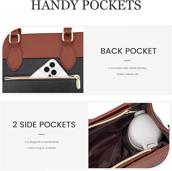 - 【Multi-pocket Handbag】 The main compartment incorporates various pockets for organized storage, including a laptop compartment, tablet compartment, large zipper pocket, two open pockets, a small zipper pocket, two pen slots. Each pocket is strategically placed for easy access and efficient organization