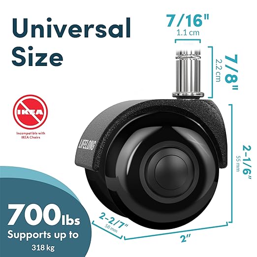 - REPLACEMENT FOR MOST OFFICE CHAIRS – Chair Wheel diameter is 2 inches, width is 2.28 inches, and height is 2.17 inches. Rest assured that our office chair wheels are compatible with almost any rolling chair (please check the size of your wheel stubs before ordering). IMPORTANT: NOT compatible with IKEA chairs. (our stem size is 7/16" x 7/8")