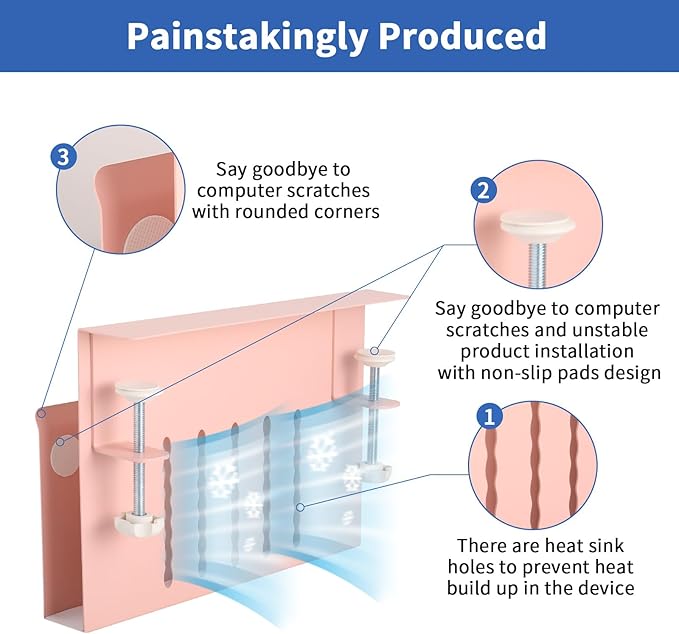 - Multifunctional Desk Side Storage & Anti -Slip And Anti -Scratch Design: This laptop holder can be retrofitted to the side of a desk to easily hold a laptop, tablet, hidden wires, interior accessories, manuals, documents, notebooks, school supplies and other items. On the inner surface of our desk laptop holder, the bottom and ends of the clamp have a non-slip sheet, which can help secure laptop in desk side hanging storage to avoid scratching desktop laptops, tablets or other devices