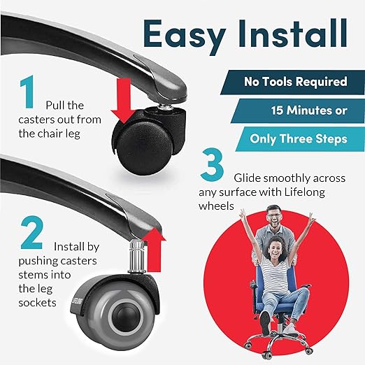 - DESK CHAIR MAT WILL NOT BE NEEDED ANYMORE – Our desk chair wheels replacement will NEVER scratch, smudge or damage your floors. Enjoy a carefree, safe glide across wood, hardwood, laminate, vinyl, tile and carpet floors all day long. P.S. Regarding the smooth rolling on carpet it depends on the pile carpet that you have, some roll better and some aren’t as smooth. High pile carpet usually rolls less smooth than low pile.