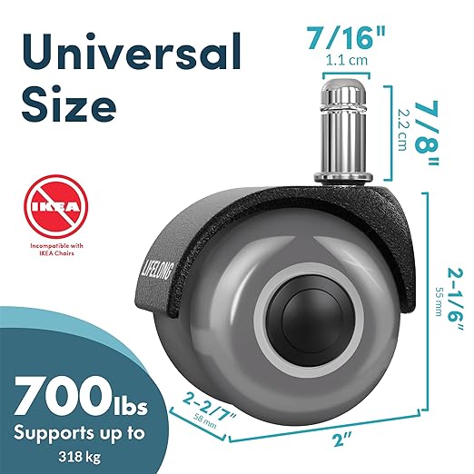 - THE LAST OFFICE CHAIR WHEELS YOU'LL NEED – Not all caster wheels are created equal. Our heavy-duty chair wheels are made from industrial-grade steel, precision ball bearings, and durable polyurethane chair casters. Its not compatible with IKEA chairs and not either with some off brand chairs, our stem size is 7/16" x 7/8".