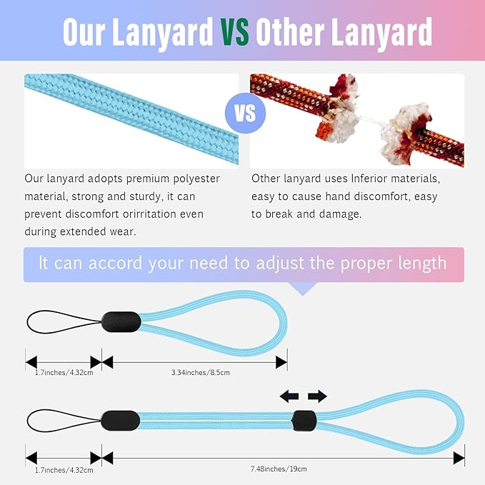 - Adjustable and Drop Protection: Our movable wrist straps measure 7.49 inches in length, With a sturdy movable buckle, long enough to adjust for different sizes of hands and freely adjust the degree of tightness, and truly realize the effect of drop protection and there is also a short rope with a length of 3.34 inches(no movable buckle).