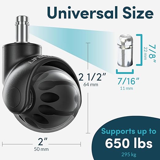- THE LAST OFFICE CHAIR WHEELS YOU'LL NEED – Not all caster wheels are created equal. Our heavy-duty chair wheels are made from industrial-grade steel, precision ball bearings, and durable polyurethane chair casters. Its not compatible with IKEA chairs and not either with some off brand chairs, our stem size is 7/16" x 7/8".
