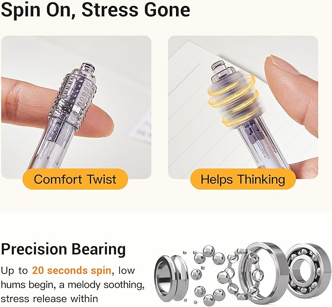 - Innovative Stress Relief: Elevate your writing with pens that double as a stress-relief tool. The unique fidget spinner top is designed to spin effortlessly, providing a soothing experience to enhance concentration and reduce anxiety in school or office environments.The spinner incorporates a precision bearing system that allows for up to 20 seconds of spin time, creating a low humming sound that can be soothing, and thus helping in stress relief.