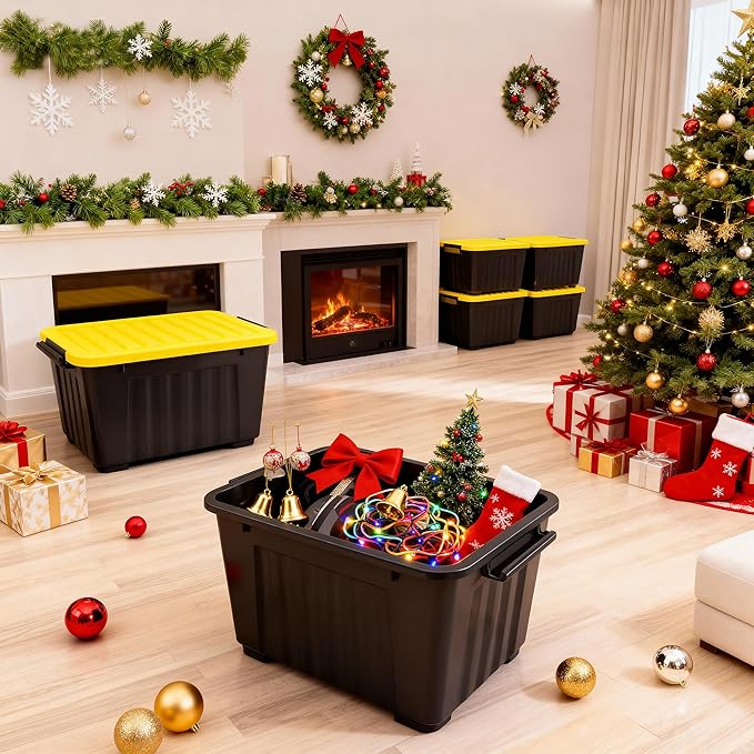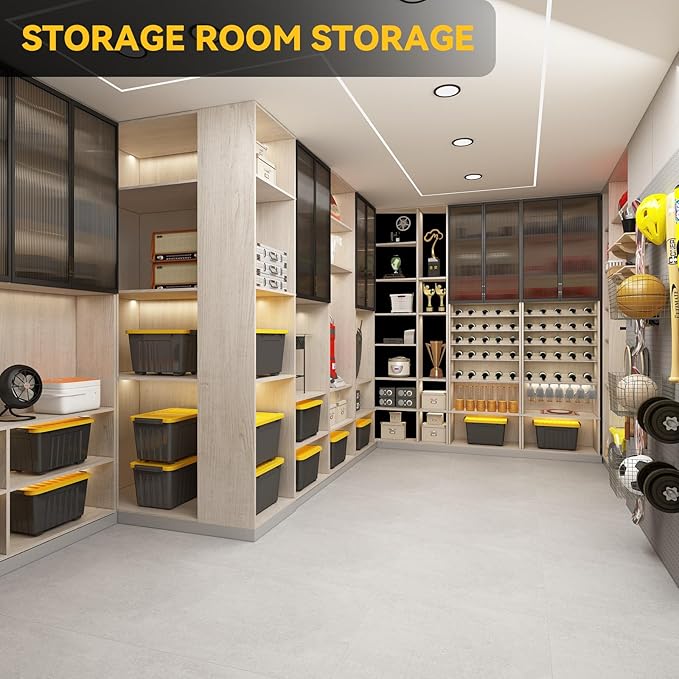 Nazhura 72 Quart Plastic Storage Bin, Stackable and Nestable Storage Boxes with Yellow Lids and Secure Latching Buckles, Large Storage Container (Black/Yellow, 72Quart-4Pack)