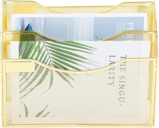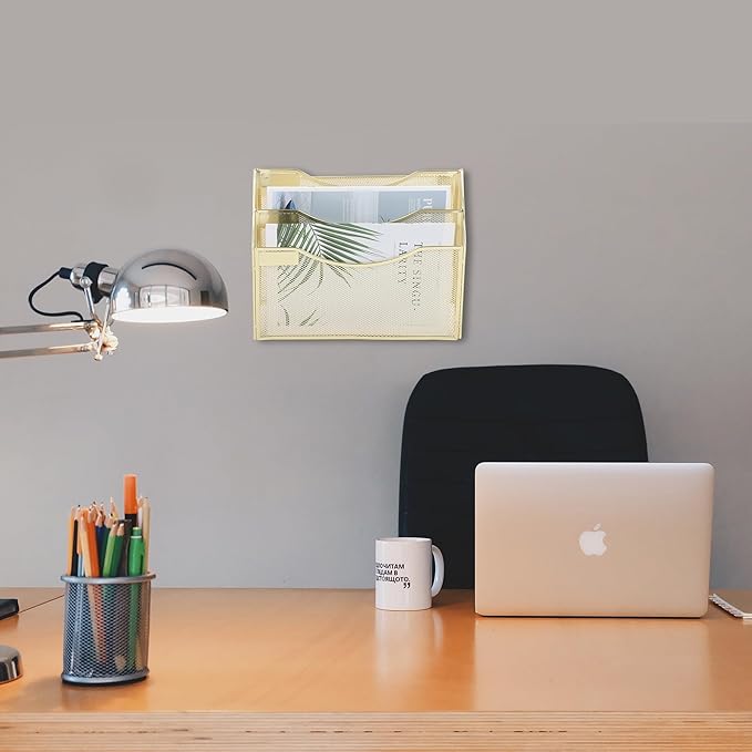 EASEPRES 3 Pocket Mesh Hanging Wall File Organizer, Wall Mounted Mail Paper Document Folder Holder, Clipboard Storage Organization Magazine Rack with Nametag Label for Office Home School, Gold