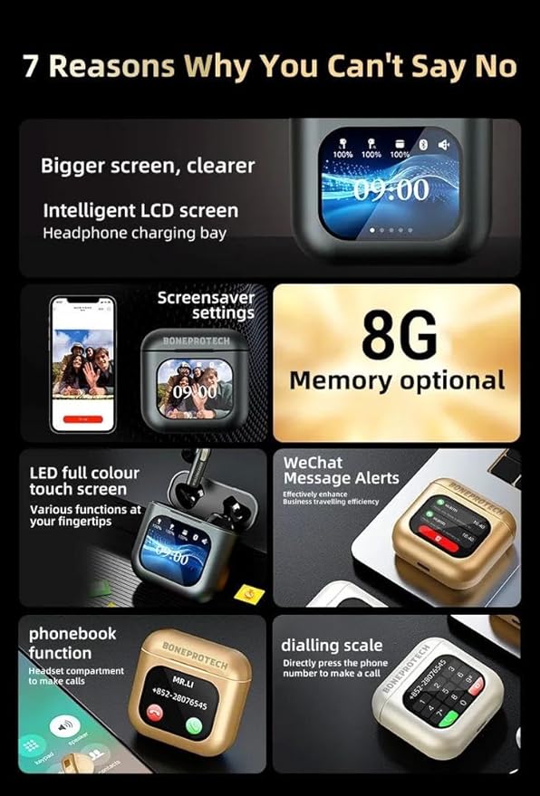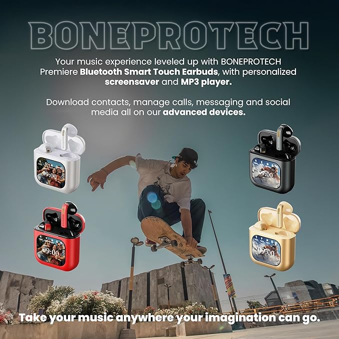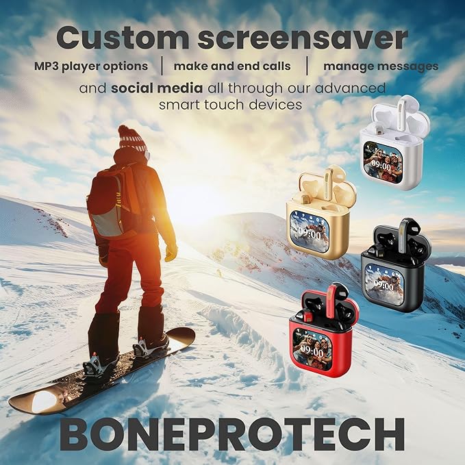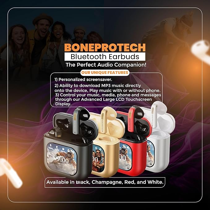 - Large Smart Touch Screen LCD Bluetooth Earbuds. Control social media videos, make and end calls, music on the smart touch screen, The newest technologies blended together for a Premium sound look and feel.