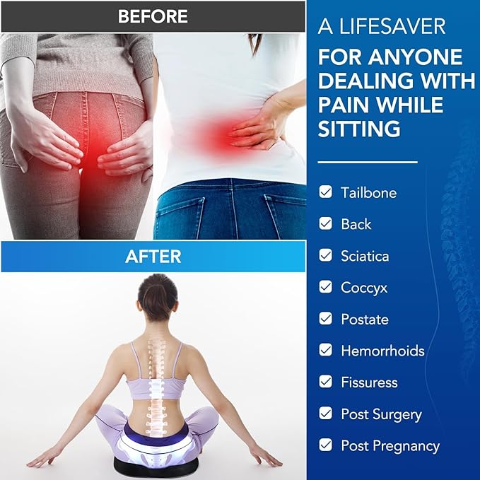 - [Effective Pain Relief]Our Donut Pillow Seat Cushion is designed to provide effective pain relief for various conditions such as hemorrhoids, tailbone pain, postpartum discomfort, and after surgery sitting relief. The memory foam seat cushions and unique contour designs distribute pressure evenly, alleviating discomfort and promoting better posture and alignment