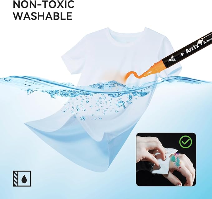 - Non-Toxic & Safe: Arrtx acrylic paint markers are water-based, so colors won't smudge or fade, and dry quickly and permanently you can enjoy your masterpiece for years to come. With high-quality certificated ink, odorless and non-toxic makes these painting pens are very safe for adults to let their imagination run wild.