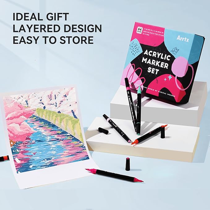 Arrtx Paint Markers Paint Pens, 64 Colors Acrylic Paint Pens Dual-Tip for Rock Painting, Ceramic, Wood, Plastic, Scrapbooking, Brush Lettering, Card Making, DIY Crafts (Fine Tip and Brush Tip)