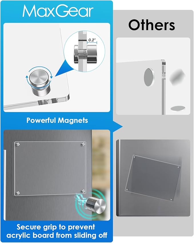 - Anti-sliding/scratch & Powerful Magnetic Design: Four Powerful magnets keep the magnetic dry erase board secure without scratching your fridge, even during opening and closing.(Note: this acrylic whiteboard is not suitable for non-magnetic stainless steel fridges or curved fridges/refrigerators.)