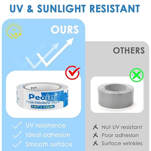 - UV Resistant: The blue painters tape 1.41 inch wide is made of high-quality crepe paper, preventing paint from seeping through and featuring UV resistance, moisture protection, and other characteristics, ensuring safety and efficiency. Perfect for all kinds of indoor and outdoor work. No need to worry about the tape getting wet
