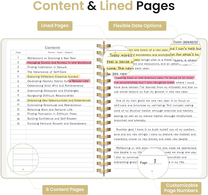- Structured College-Ruled Pages: Featuring 7mm college-ruled lines, this journal notebook helps keep your writing organized and legible. The evenly spaced lines are perfect for structured notes, work lists, or detailed writing, making it an excellent choice for school students, professionals, and writers alike. It also includes 6 content pages, perfect for creating an index for easy reference.