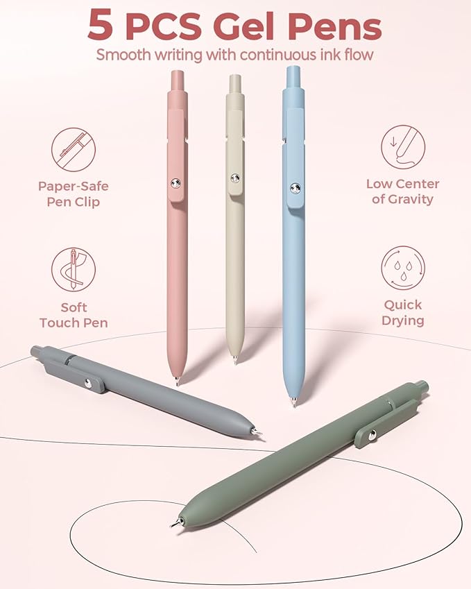 - [5PCS Black Ink Gel Pens] These retractable gel pens feature a soft, skin-like barrel for a comfortable feel. The low center of gravity ensures smooth and steady writing, while the quick-dry ink keeps your notes neat and smudge-free. They’re a smart addition to your college supplies, school stuff, or office supplies. Five extra refills are included for longer use
