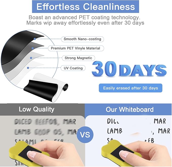- Effortless Cleanliness --- Our magnetic whiteboard boasts an advanced PET coating technology for a smooth, easy-to-clean surface. The magnetic fridge board can withstands 100,000 writes and erases without stains. Even after 30 days, marks wipe away effortlessly. Enjoy clear, smudge-free writing and convenience every time! (Stubborn stains can be removed with a damp cloth. )
