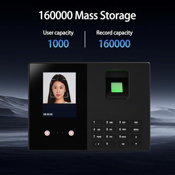 - ✅ Multi-function 4-in-1 use: This time attendance device supports multiple employee identification methods, including 1000pcs face recognition, 1000pcs palm print, 3000pcs fingerprint, and 1000pcs password. With the capacity to store 160,000 records, it can meet the needs of various organizations.