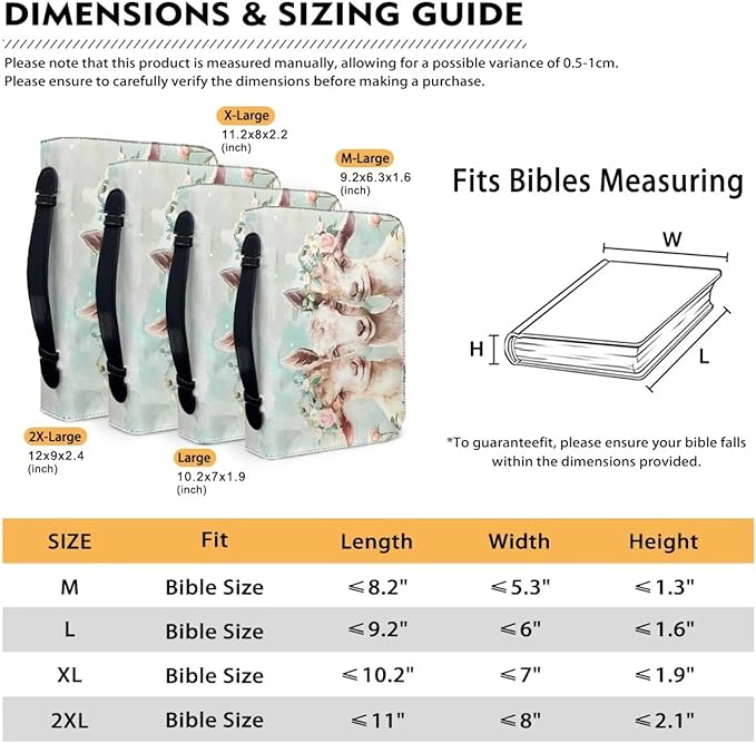 • 【MULTIPLE SIZES AVAILABLE】The Bible Case is available in four different sizes.M--6.3*9.2*1.6 inch; L--7*10.2*1.9 inch; XL--8*11.2*2.2 inch; 2XL--9*12*2.4inch. You can choose the one that fits your Bible perfectly.Please check the size chart before you purchase.