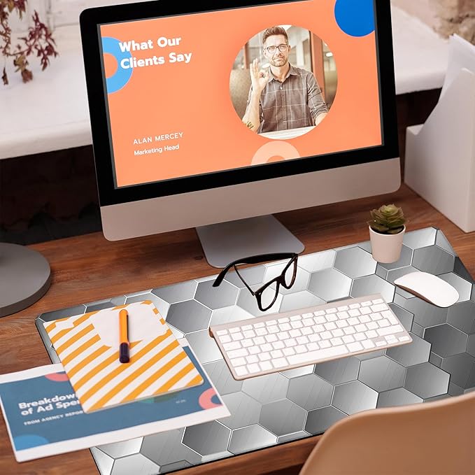 Large Gaming Mouse Pad for Desk, Silver Technology Honeycomb Desk Mat, Sci-Fi Honeycomb Desk Pad, 31.5"x15.7" Extended Big Computer Keyboard Mouse Pad with Non-Slip Base and Stitched Edge