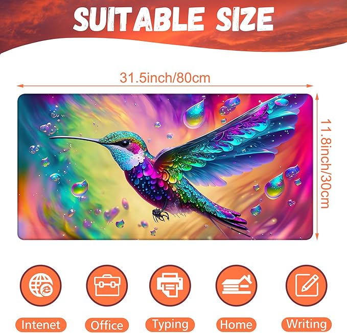 Large Gaming Mouse Pad for Desk, Colorful Hummingbird Desk Mat, Bright Hummingbird Desk Pad, 31.5"x15.7" Extended Big Computer Keyboard Mouse Pad with Non-Slip Base and Stitched Edge