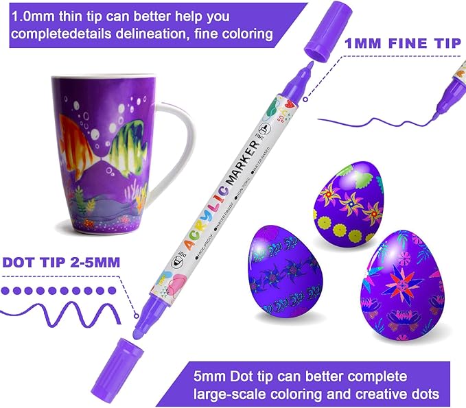 - Multi purpose Dual Tip Acrylic Paint Pens with Fine and Dot Tips ---- Each KEMYR pen is equipped with a 1-5 mm dot tip for filling large areas and bold points, and a 1 mm fine tip for lines and details work.