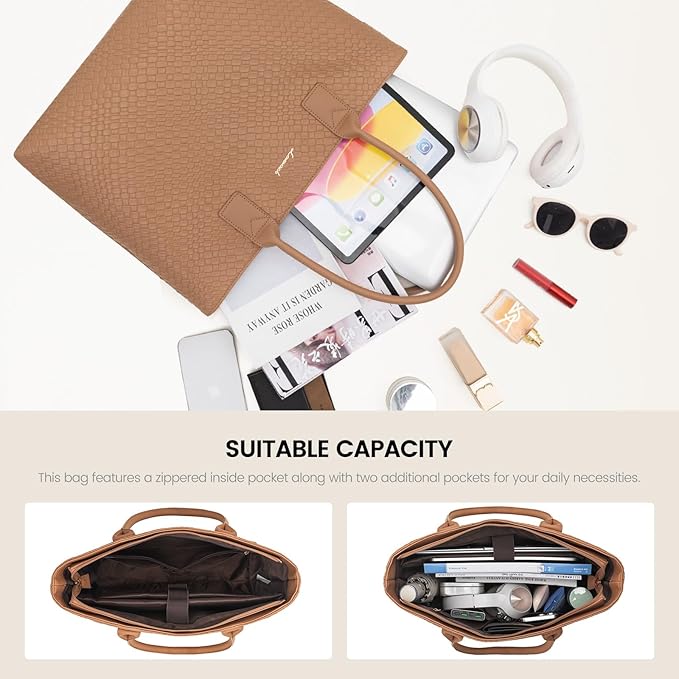 - Versatile Spacious Storage: This leather tote bag for women includes 1 large open pocket for A4 documents, books, clothing, 2 padded compartments for 15.6-inch laptop and iPad, 1 zippered pocket, 3 slit pockets, and 1 small zippered back pocket for your cell phone and keys. Secure and easy to use, it is the perfect long-term companion for work, shopping, dating, and college