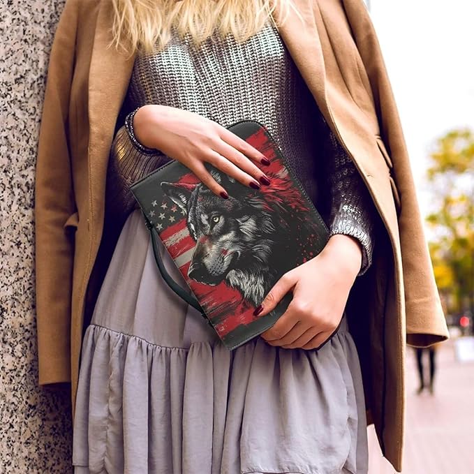 Lotusorchid American Flag Wolf Bible Bags, Faux Leather Bible Covers with Handle Pockets for Women, Portable Sturdy Bible Bag for Men, Christian Bible Study Accessories, Black and Red, XL