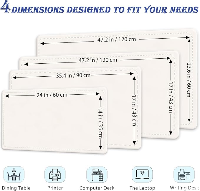 - Large Desk Mat: Size of 24" x 14" (60 cm x 35 cm), large enough to fully accommodate your laptop, mouse, and keyboard. The surface is also enough to accommodate your mobile phone and other desktop accessories. Its comfortable and smooth surface offers a comfortable resting surface for your hands, and an ideal and comfortable workspace for you to write, draw, and slide your mouse freely